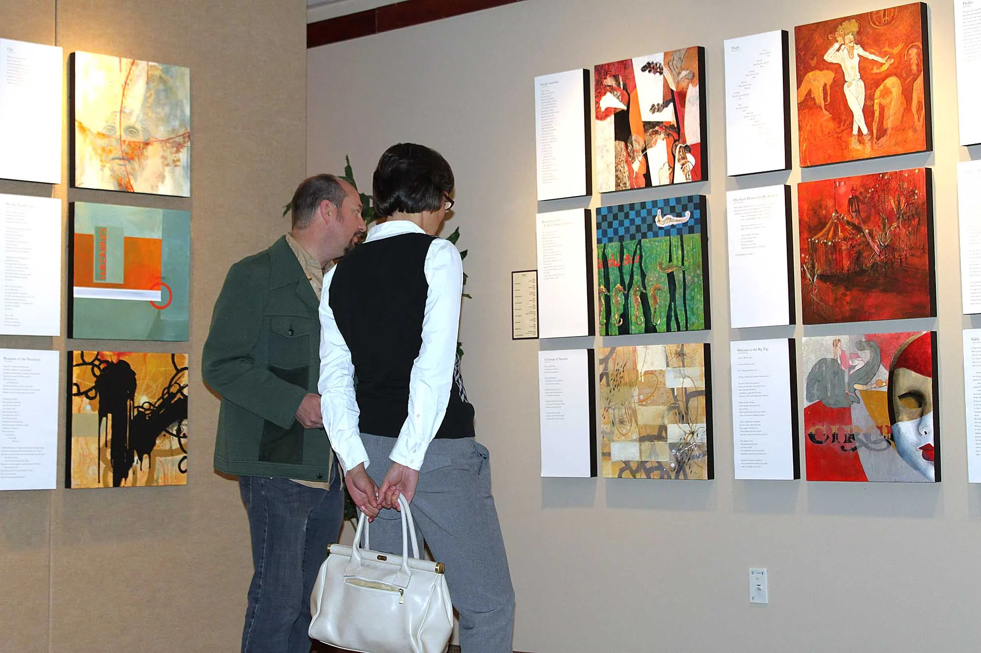 The final exhibit, curated by Shawn Stradley, Steven Stradley, and myself, consisted of the 81 poems and 81 corresponding artworks, and showed at the Bountiful/Davis Art Center in Bountiful, Trolley Square in Salt Lake City, the Rose Wagner Theater in Salt Lake City, and the Utah Cultural Celebration Center in West Valley City in 2009. For display purposes, each piece of art was 18 inches square, and each poem was mounted on a 9” x 18” panel. The panels were arranged in 9 grids, one per muse.