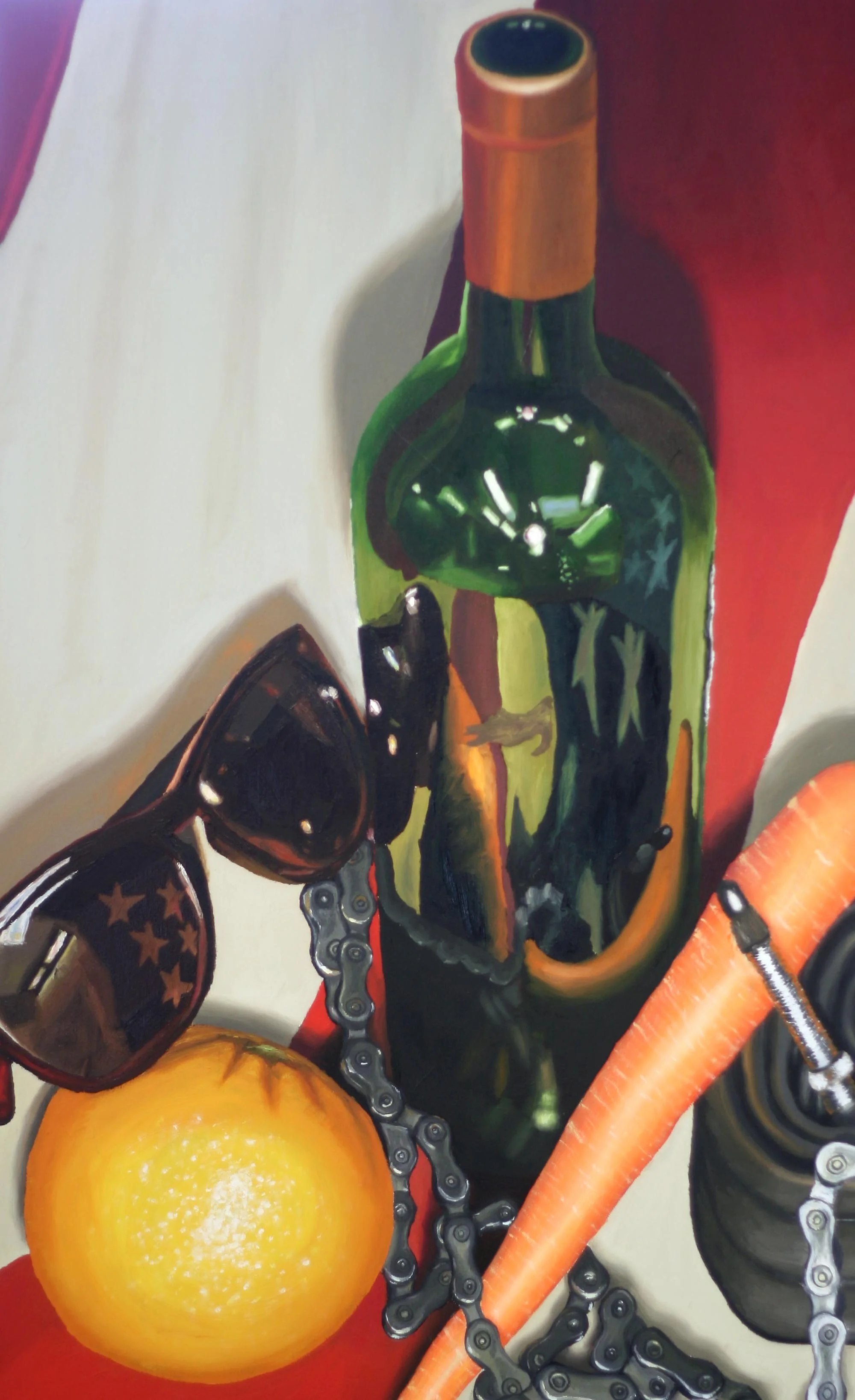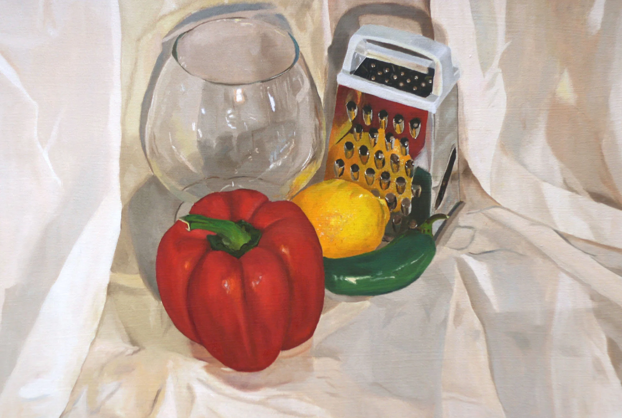 While I initially debated the wisdom of throwing beginning painting students into a photorealist assignment, I believed it was possible for them to take on this challenge and succeed. I also wanted students to walk away from this class with something they could be proud of, and I felt like this assignment would provide that. This assignment was inspired by Ralph Goings’ work, and followed a color theory assignment in which students had to match colors on a printed color wheel. The photorealism assignment was essentially an extreme version of this color-matching exercise. Students created their own still life (within defined parameters), and then worked from a photo of that still life, first doing a monochromatic underpainting with raw umber to establish value relationships, and then working to match the colors and values from the original photo.