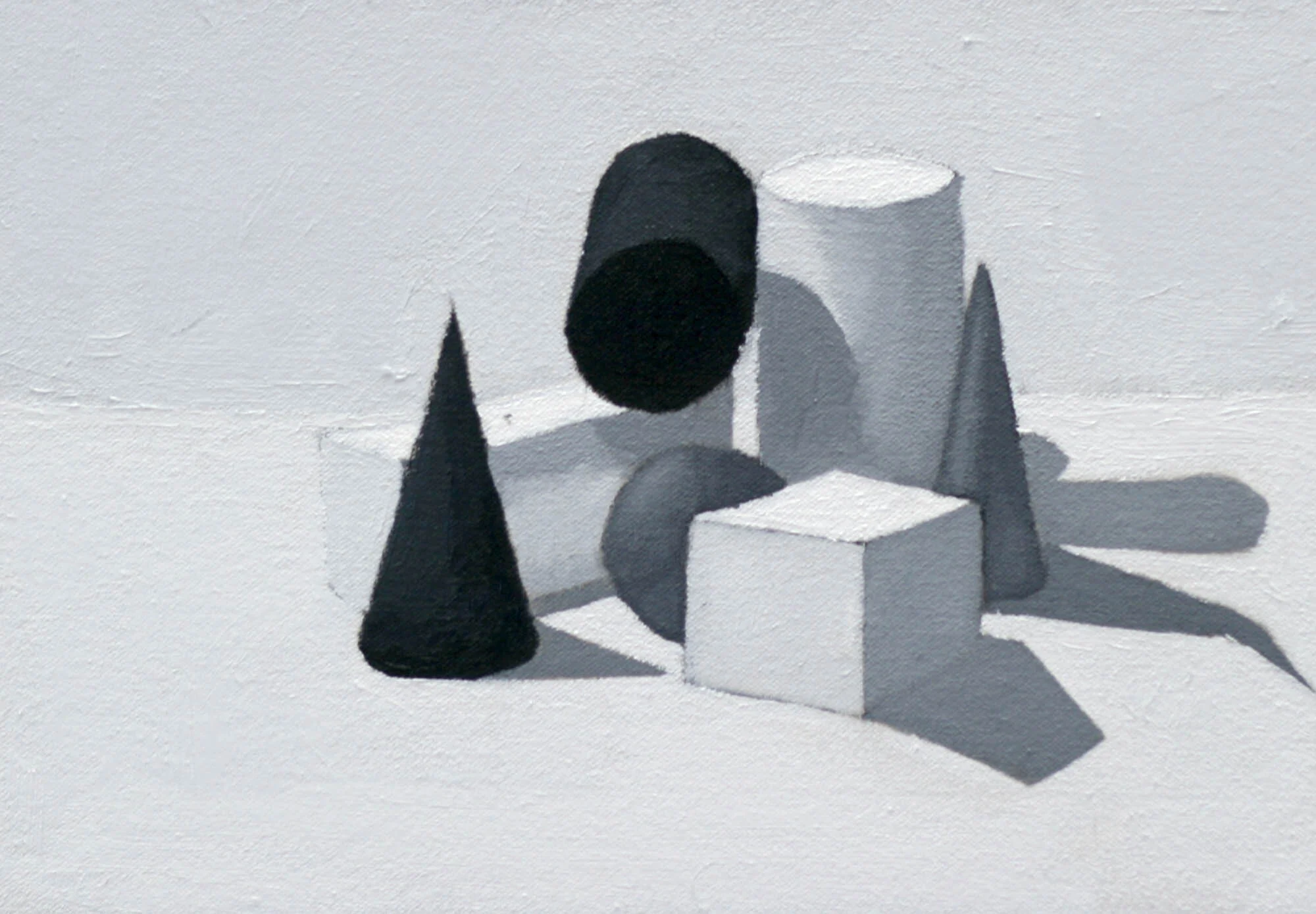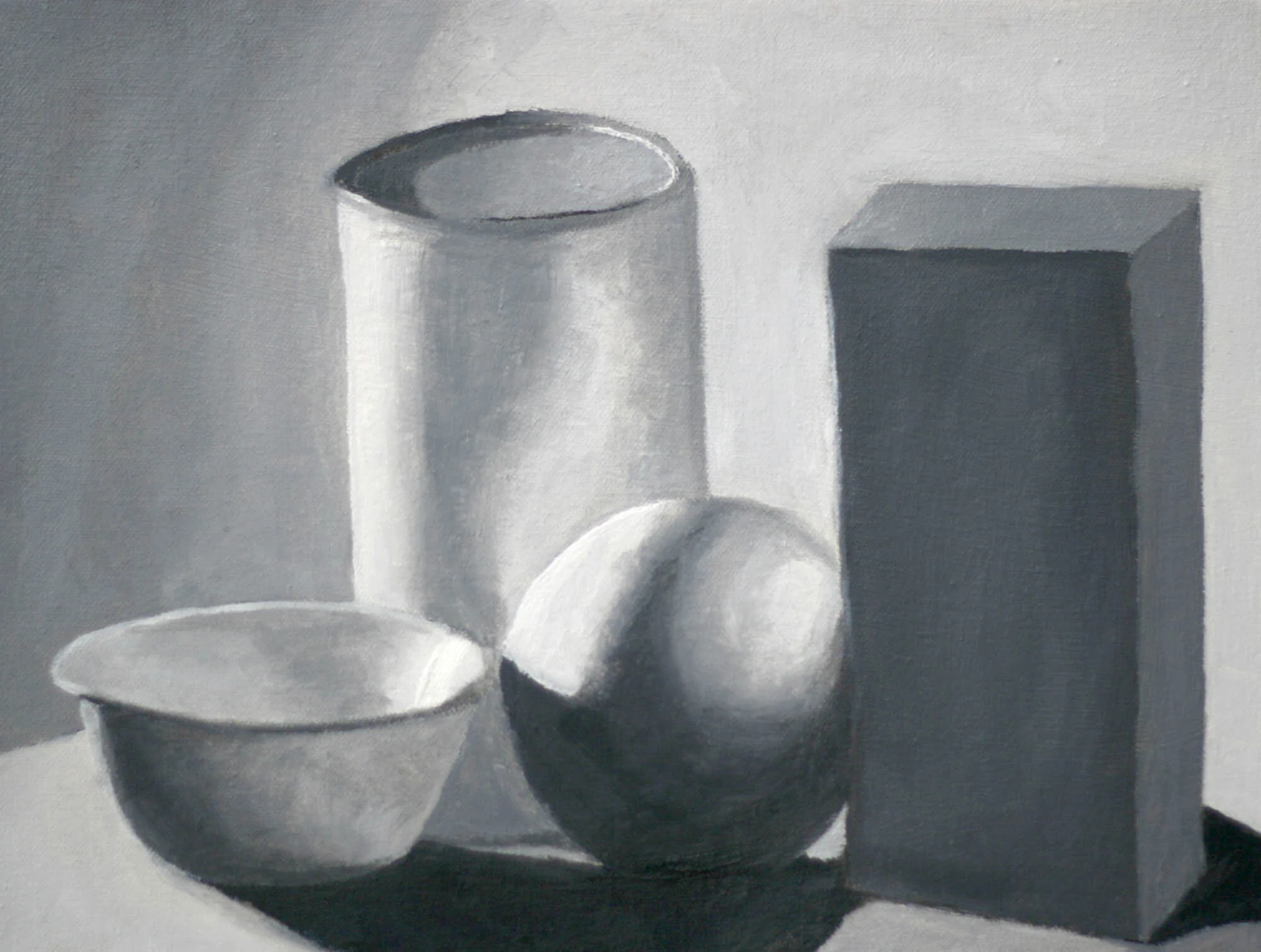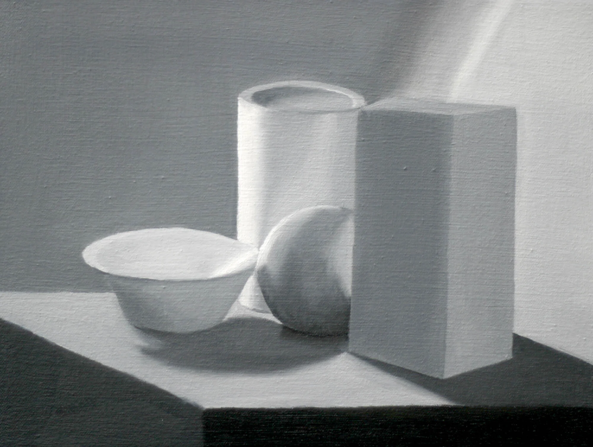 Since many of my students were not art majors, and some had not taken Beginning Drawing, this was a crash course in observational drawing, and the use of value. This painting was limited to grayscale values, and followed an exercise in which students created a 6-step value scale, from white to black. The still life itself consisted of either all-white or monochromatic objects.